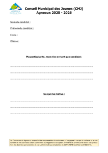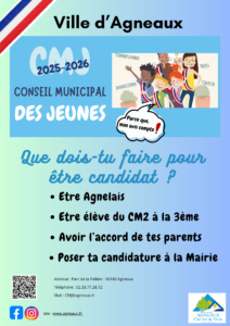Le Conseil Municipal des Jeunes est composé de jeunes conseillers municipaux élus pour un mandat d’un an renouvelable une fois. Le CMJ est un organe de consultation et de propositions. Par ce biais, la Municipalité donne la parole aux jeunes Agnelais afin qu’ils s’impliquent dans la vie de leur commune.